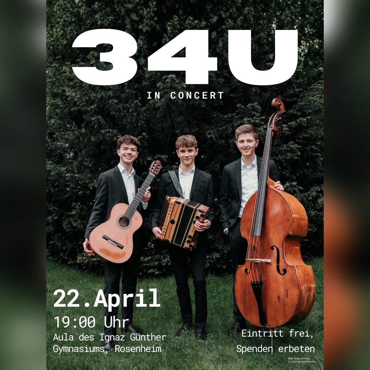Das Trio „34u“ spielt um 19 Uhr in der Aula des Ignaz-Günther-Gymnasium in Rosenheim. Der Eintritt ist frei, um Spenden zugunsten des Sozialfonds der Schule wird gebeten.